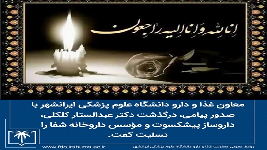 معاون غذا و دارو دانشگاه علوم پزشکی ایرانشهر با صدور پیامی، درگذشت دکتر عبدالستار کلکلی، داروساز پیشکسوت و مؤسس داروخانه شفا را تسلیت گفت.
